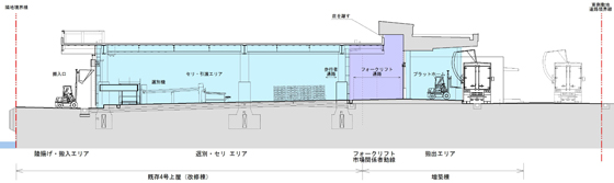 高度衛生管理型魚市場の改修と増築により、動線と作業・機能の再配置、および外部(鳥害と人)危害区画の徹底を図る。