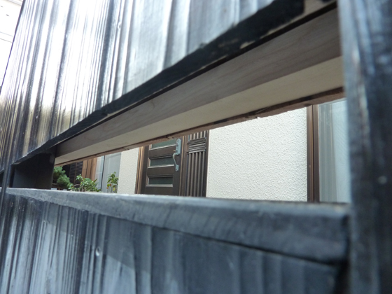 焼杉塀の側面に空いている開口は隣地へ風が通りぬけるようにしたもの。