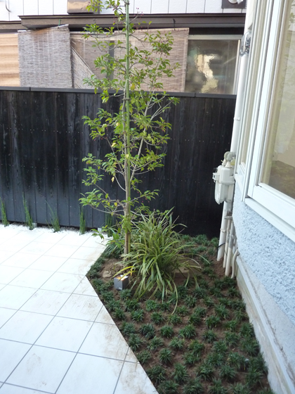 既存の門、フェンス塀を撤去し、門から塀にかけて黒い塗料を塗った焼杉を採用し、地面の白タイルとのコントラストによって建物へと誘導する、その両脇に玉砂利を敷きトクサを植え全体的に落ち着きのある和のデザインを目指しました。