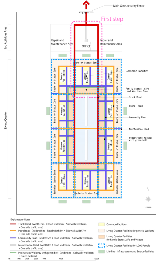 所在地 イラク マイサーン県 事業主 業務内容 12000人規模の住区計画 期間 2012年 油田会社の従業員12000人規模の住区を計画。住居は一般単身者従業員用住戸・VIP(出張者)用住戸にコンテナユニット、家族型従業員用として鉄骨造の住戸として計画。第1期として1200人規模の住居エリアに付帯施設(食堂・利便複合施設)を整備し第2期6000人、第3期12000人と段階整備計画とした。