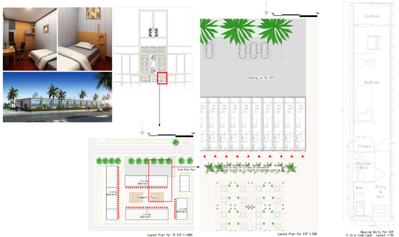 所在地 イラク マイサーン県 事業主 業務内容 12000人規模の住区計画 期間 2012年 油田会社の従業員12000人規模の住区を計画。住居は一般単身者従業員用住戸・VIP(出張者)用住戸にコンテナユニット、家族型従業員用として鉄骨造の住戸として計画。第1期として1200人規模の住居エリアに付帯施設(食堂・利便複合施設)を整備し第2期6000人、第3期12000人と段階整備計画とした。