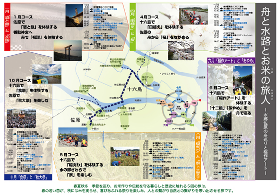 稲作には「豊作祈願」、「田植え」、「豊饒の実り」、「稲刈り」、「食祭」と時系列を巡る成長の旅があります。その折々において地域の神事、行事、催事、イベントなど(1月:香取神宮の初詣、4月:両総用水や横利根閘門のお花見、6月:あやめ祭り、8月:水の郷さわらのまつり、10月:秋の大祭り)に参加して頂く事が密接に関わっており、「稲作アート」を通して1年5回水郷佐原を十全に体感してもらえます。