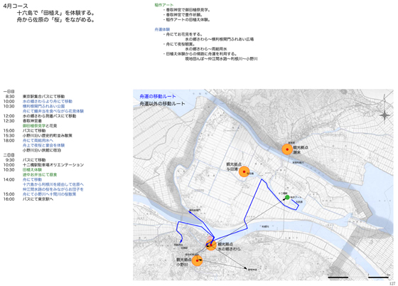 稲作には「豊作祈願」、「田植え」、「豊饒の実り」、「稲刈り」、「食祭」と時系列を巡る成長の旅があります。その折々において地域の神事、行事、催事、イベントなど(1月:香取神宮の初詣、4月:両総用水や横利根閘門のお花見、6月:あやめ祭り、8月:水の郷さわらのまつり、10月:秋の大祭り)に参加して頂く事が密接に関わっており、「稲作アート」を通して1年5回水郷佐原を十全に体感してもらえます。