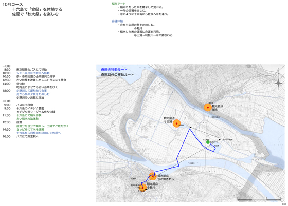 稲作には「豊作祈願」、「田植え」、「豊饒の実り」、「稲刈り」、「食祭」と時系列を巡る成長の旅があります。その折々において地域の神事、行事、催事、イベントなど(1月:香取神宮の初詣、4月:両総用水や横利根閘門のお花見、6月:あやめ祭り、8月:水の郷さわらのまつり、10月:秋の大祭り)に参加して頂く事が密接に関わっており、「稲作アート」を通して1年5回水郷佐原を十全に体感してもらえます。